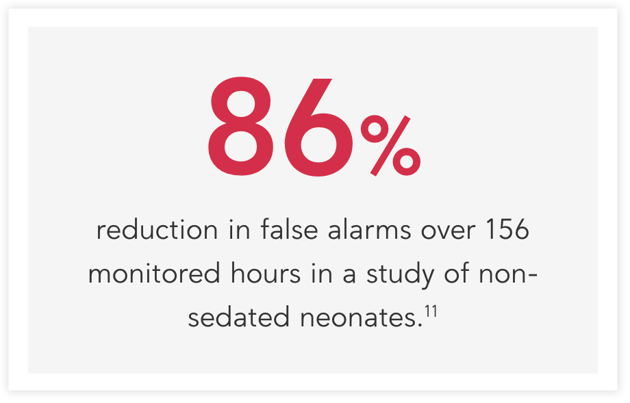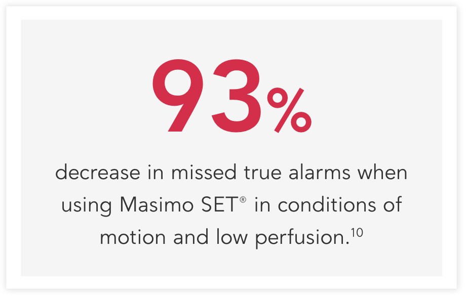 La précision de l'oxymétrie de pouls Masimo SET® entraîne une diminution des fausses alarmes et une meilleure détection des alarmes réelles,10 ce qui renforce la confiance des cliniciens concernant les mesures pour tous les types de patients.