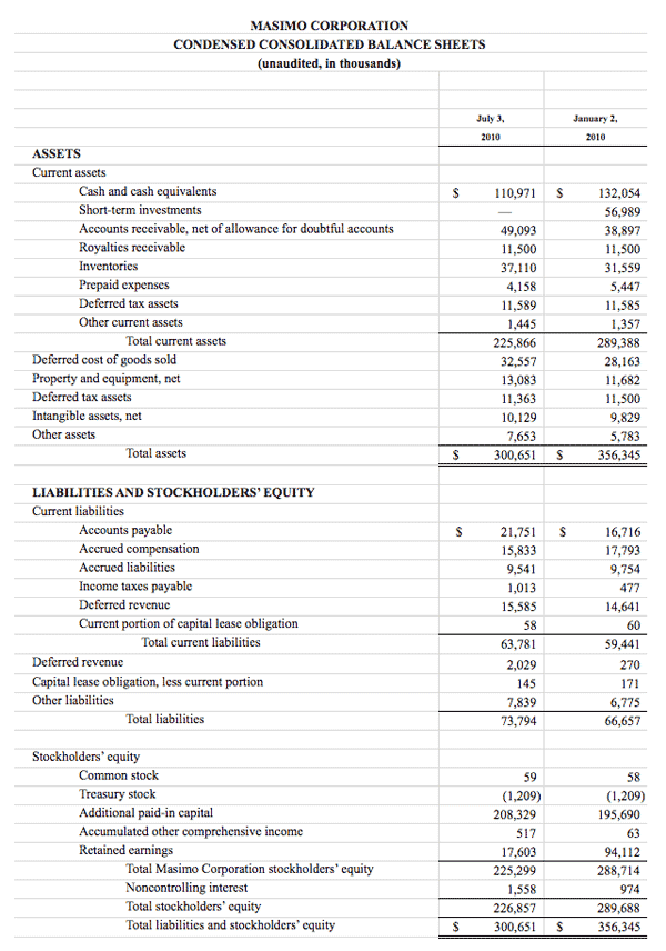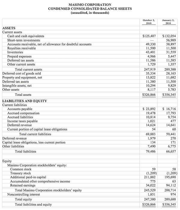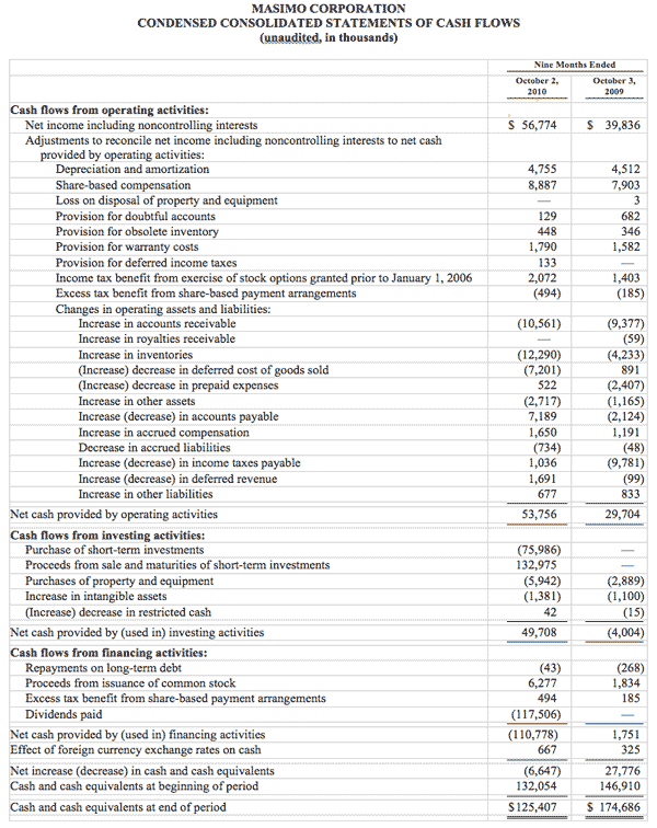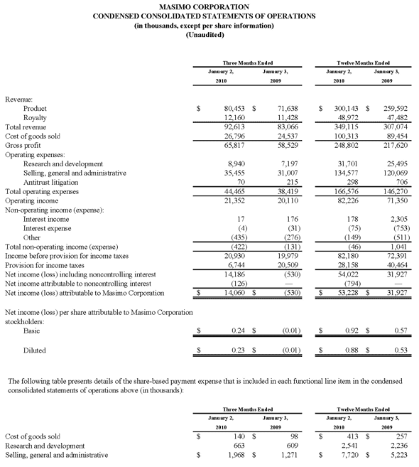 Irvine, California, February 16, 2010 – Masimo (NASDAQ: MASI), the inventor of Pulse CO-Oximetry and Measure-Through Motion and Low Perfusion pulse oximetry, today announced its financial results for the fourth quarter and year ended January 2, 2010.