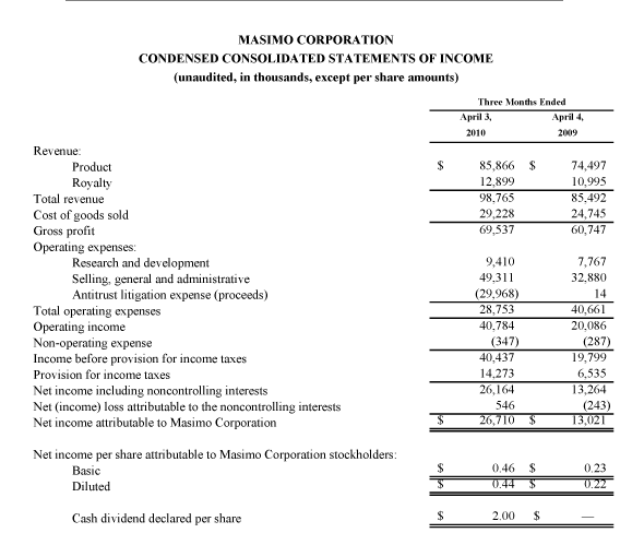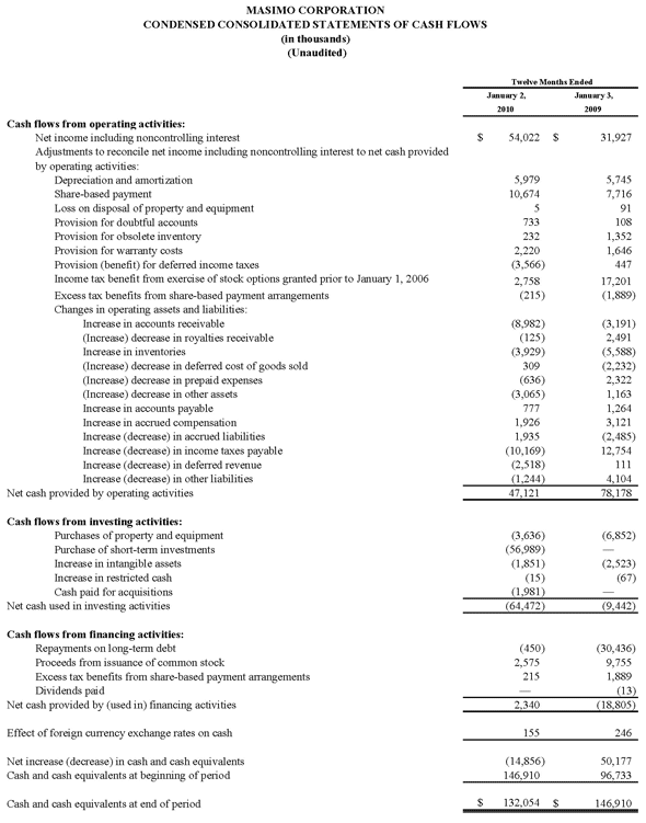 All statements other than statements of historical facts included in this press release that address activities, events or developments that we expect, believe or anticipate will or may occur in the future are forward-looking statements including, in particular, the statements about: our financial condition, results of operations, prospects and business generally; expectations regarding our ability to design and deliver innovative new noninvasive technologies; and expectations for total revenues, including royalty revenues, product revenues and Rainbow revenues, non-cash stock based compensation charges, and GAAP earnings per share for the full fiscal year 2010. These forward-looking statements are based on management's current expectations and beliefs and are subject to uncertainties and factors, all of which are difficult to predict and many of which are beyond our control and could cause actual results to differ materially and adversely from those described in the forward-looking statements. These risks include, but are not limited to, those related to: our dependence on Masimo SET and Masimo Rainbow SET products and technologies for substantially all of our revenue; any failure in protecting our intellectual property exposure to competitors' assertions of intellectual property claims; the highly competitive nature of the markets in which we sell our products and technologies; any failure to continue developing innovative products and technologies; the lack of acceptance of any new products and technologies of ours; obtaining regulatory approval of our current and future products and technologies, including the recently announced total hemoglobin measurement; the risk that the implementation of our international realignment, will not produce the anticipated operational and financial benefits, including a continued lower effective tax rate; the loss of our customers the failure to retain and recruit senior management; product liability claims exposure; a failure to obtain expected returns from the amount of intangible assets we have recorded; the maintenance of our brand; the impact of the decline in the worldwide credit markets on us and our customers; the amount and type of equity awards that we may grant to employees and service providers in the future; and other factors discussed in the "Risk Factors" section of our most recent periodic reports filed with the Securities and Exchange Commission ("SEC"), which you may obtain for free on the SEC's website at www.sec.gov. Although we believe that the expectations reflected in our forward-looking statements are reasonable, we do not know whether our expectations will prove correct. You are cautioned not to place undue reliance on these forward-looking statements, which speak only as of the date hereof, even if subsequently made available by us on our website or otherwise. We do not undertake any obligation to update, amend or clarify these forward-looking statements, whether as a result of new information, future events or otherwise, except as may be required under applicable securities laws.