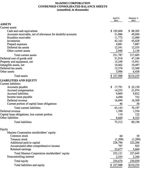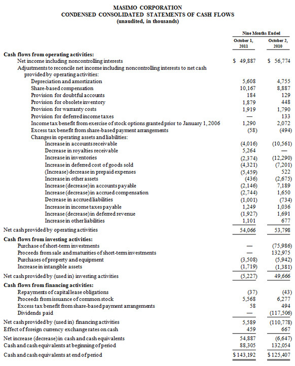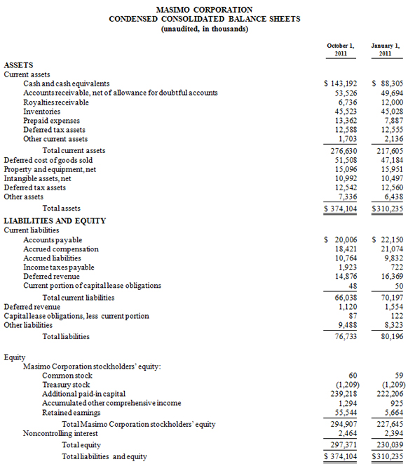 Masimo expects fiscal 2011 total revenue to be between $446 million and $463 million, including product revenue in the range of $415 million to $430 million, and royalty revenue in the range of $31 million and $33 million. Included within these product revenue ranges are 2011 rainbow revenue expectations of $40 million to $50 million. As a result, the company expects fiscal 2011 GAAP earnings per share to be between $1.17 and $1.25. Each of the components of Masimo's guidance set forth above is an estimate only and actual performance could differ.