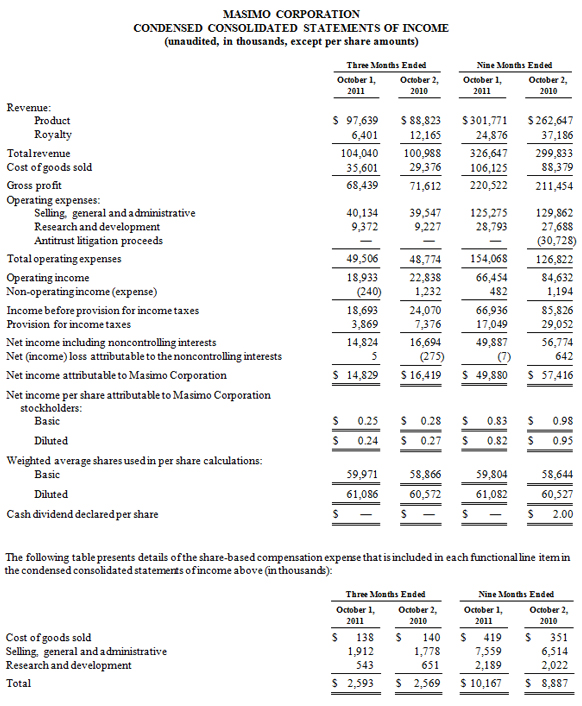 All statements other than statements of historical facts included in this press release that address activities, events or developments that we expect, believe or anticipate will or may occur in the future are forward-looking statements including, in particular, the statements about our financial condition, results of operations and business generally; expectations regarding our ability to design and deliver innovative new noninvasive technologies; and expectations for total revenue, royalty revenue and product revenue, including rainbow revenue, and GAAP earnings per share for the full fiscal year 2011. These forward-looking statements are based on management's current expectations and beliefs and are subject to uncertainties and factors, all of which are difficult to predict and many of which are beyond our control and could cause actual results to differ materially and adversely from those described in the forward-looking statements. These risks include, but are not limited to, those related to: our dependence on Masimo SET and Masimo rainbow SET products and technologies for substantially all of our revenue; any failure in protecting our intellectual property exposure to competitors' assertions of intellectual property claims; the highly competitive nature of the markets in which we sell our products and technologies; any failure to continue developing innovative products and technologies; the lack of acceptance of our current or future products and technologies; obtaining regulatory approval of our current and future products and technologies; the risk that the implementation of our international realignment will not continue to produce anticipated operational and financial benefits, including a continued lower effective tax rate; the loss of our customers; the failure to retain and recruit senior management; product liability claims exposure; a failure to obtain expected returns from the amount of intangible assets we have recorded; the maintenance of our brand; the impact of the decline in the worldwide credit markets on us and our customers; the amount and type of equity awards that we may grant to employees and service providers in the future; and other factors discussed in the "Risk Factors" section of our most recent periodic reports filed with the Securities and Exchange Commission ("SEC"), which you may obtain for free on the SEC's website at www.sec.gov. Although we believe that the expectations reflected in our forward-looking statements are reasonable, we do not know whether our expectations will prove correct. You are cautioned not to place undue reliance on these forward-looking statements, which speak only as of the date hereof, even if subsequently made available by us on our website or otherwise. We do not undertake any obligation to update, amend or clarify these forward-looking statements, whether as a result of new information, future events or otherwise, except as may be required under applicable securities laws.