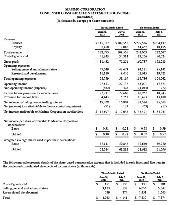 All statements other than statements of historical facts included in this press release that address activities, events or developments that we expect, believe or anticipate will or may occur in the future are forward-looking statements including, in particular, the statements about our financial condition, results of operations and business generally; expectations regarding our ability to design and deliver innovative new noninvasive technologies; demand for our technologies; and expectations for total revenue, royalty revenue and product revenue, including rainbow revenue, and GAAP earnings per share, for the full fiscal year 2012. These forward-looking statements are based on management's current expectations and beliefs and are subject to uncertainties and factors, all of which are difficult to predict and many of which are beyond our control and could cause actual results to differ materially and adversely from those described in the forward-looking statements. These risks include, but are not limited to, those related to: our dependence on Masimo SET and Masimo rainbow SET products and technologies for substantially all of our revenue; any failure in protecting our intellectual property exposure to competitors' assertions of intellectual property claims; the highly competitive nature of the markets in which we sell our products and technologies; any failure to continue developing innovative products and technologies; the lack of acceptance of any of our current or future products and technologies; obtaining regulatory approval of our current and future products and technologies; the risk that the implementation of our international realignment will not continue to produce anticipated operational and financial benefits, including a continued lower effective tax rate; the loss of our customers; the failure to retain and recruit senior management; product liability claims exposure; a failure to obtain expected returns from the amount of intangible assets we have recorded; the maintenance of our brand; the impact of the decline in the worldwide credit markets on us and our customers; the amount and type of equity awards that we may grant to employees and service providers in the future; and other factors discussed in the "Risk Factors" section of our most recent periodic reports filed with the Securities and Exchange Commission ("SEC"), including our most recent Form 10-K and Form 10-Q, all of which you may obtain for free on the SEC's website at www.sec.gov. Although we believe that the expectations reflected in our forward-looking statements are reasonable, we do not know whether our expectations will prove correct. You are cautioned not to place undue reliance on these forward-looking statements, which speak only as of the date hereof, even if subsequently made available by us on our website or otherwise. We do not undertake any obligation to update, amend or clarify these forward-looking statements, whether as a result of new information, future events or otherwise, except as may be required under applicable securities laws.