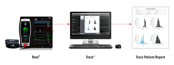 Trace is the first data visualization and reporting software compatible with the full capabilities of the Masimo Root Patient Monitoring and Connectivity Platform, including Radical-7 and Radius-7® Pulse CO-Oximeters®, Root with integrated noninvasive blood pressure and temperature, and connected MOC-9™ modules such as SedLine® brain function monitoring, ISA™ and ISA OR+ capnography, and O3® regional oximetry.