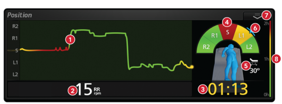 1. Trend Line displays the duration of time spent in the right-side, supine, or left-side position, tracks movement, and uses color to indicate tissue stress over time.