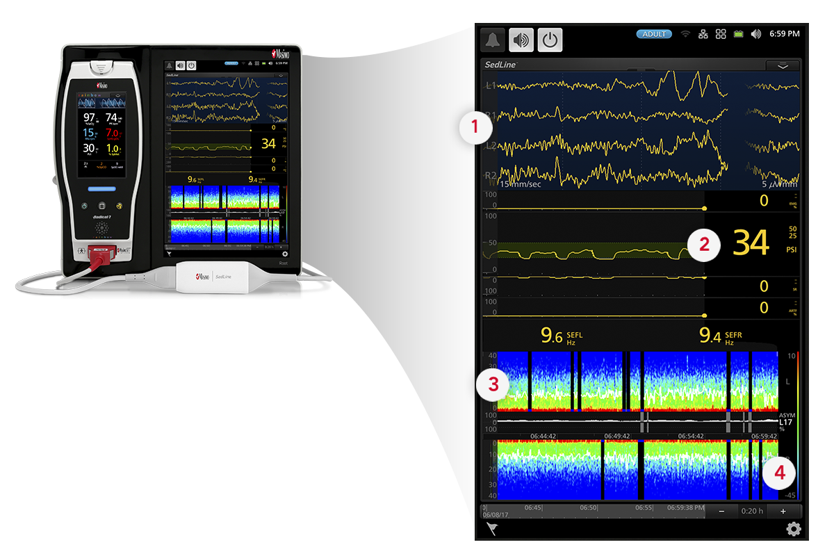 SedLine connects seamlessly to the Root Patient Monitoring and Connectivity Platform—featuring a customizable, easy-to-interpret display that provides multiple views of brain monitoring data for expanded visibility in the OR and ICU.