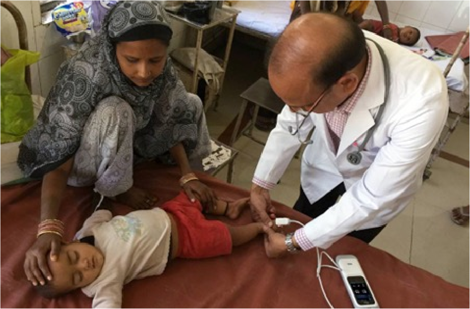 Clinician using Masimo SET® pulse oximetry to monitor a child in Kenya